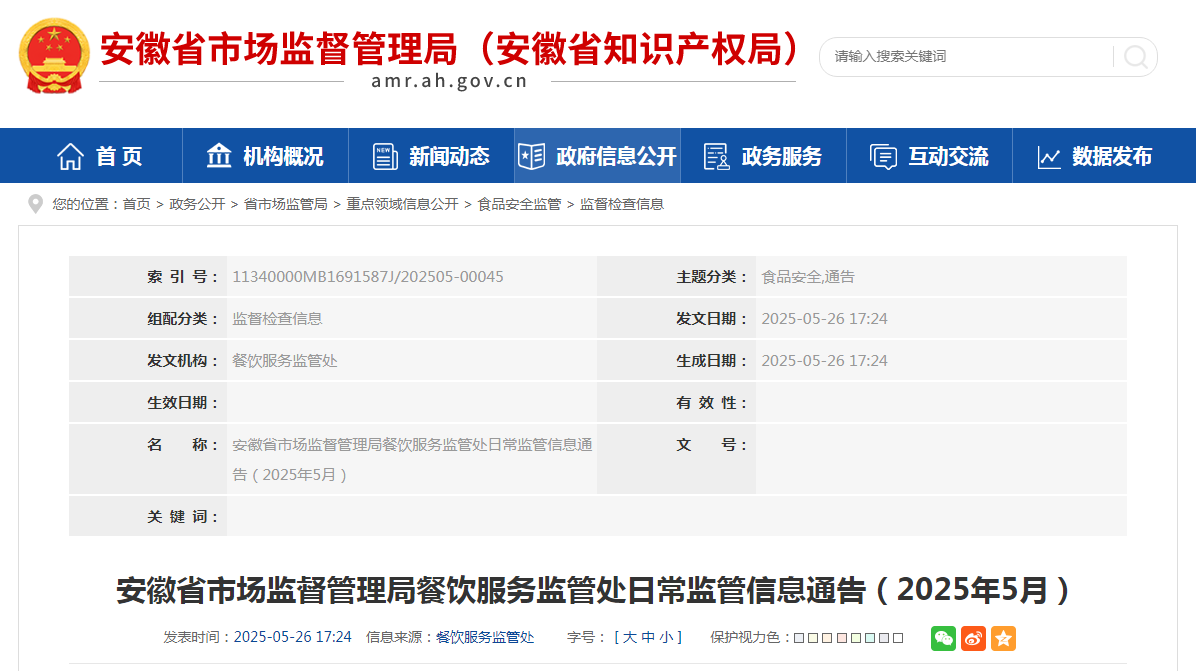 | 安徽省市場監(jiān)督管理局餐飲服務(wù)監(jiān)管處日常監(jiān)管信息通告(2025年5月) | ||||||||