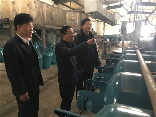 杭州市質(zhì)監(jiān)局局長樓倻捷(右二)帶隊(duì)檢查液化石油氣充裝單位安全生產(chǎn)工作及鋼瓶定檢必?fù)Q新閥工作落實(shí)情況。