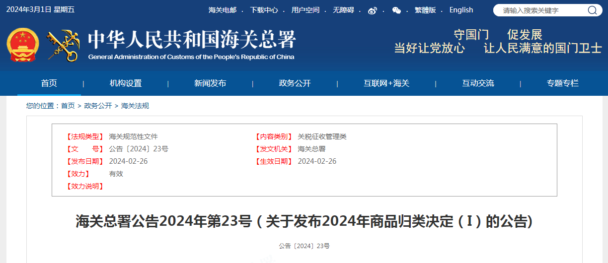 海關(guān)總署公告2024年第23號(hào)(關(guān)于發(fā)布2024年商品歸類決定(I)的公告)