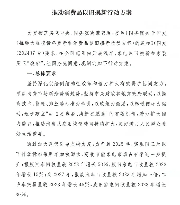 一起看《推動(dòng)消費(fèi)品以舊換新行動(dòng)方案》原文