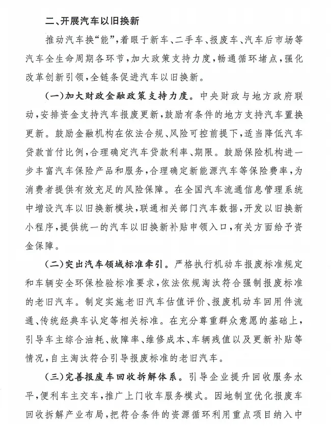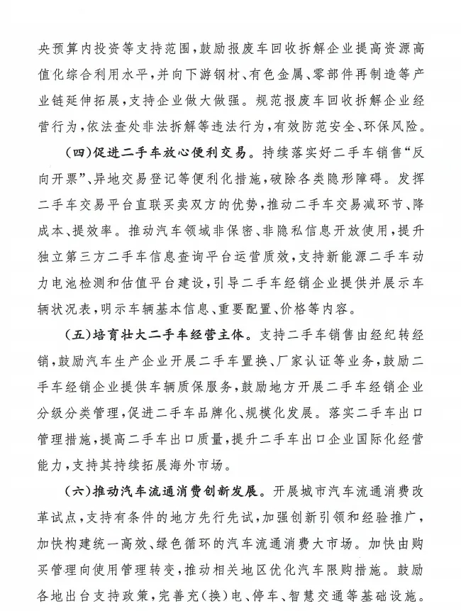 對報(bào)廢高排放乘用車或符合條件的新能源乘用車,并購買符合節(jié)能要求或新能源汽車的消費(fèi)者給予定額補(bǔ)貼;金融機(jī)構(gòu)可自主確定自用汽車貸款首付比例;完善充(換)電、停車、智慧交通等基礎(chǔ)設(shè)施;實(shí)施二手車交易反向開票政策;推廣上門收車服務(wù)模式。