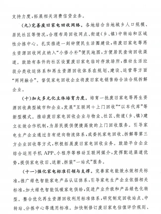 中央財(cái)政安排現(xiàn)代商貿(mào)流通體系建設(shè)、縣域商業(yè)體系建設(shè)等資金支持廢舊家電等再生資源回收體系建設(shè);鼓勵(lì)有條件的地方對消費(fèi)者購買綠色智能家電給予補(bǔ)貼;支持家電企業(yè)對以舊家電換購節(jié)能家電的消費(fèi)者給予優(yōu)惠。