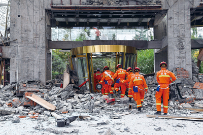 8月9日,救援人員進(jìn)入地震中受損的九寨天堂洲際大飯店大堂進(jìn)行搜救。8月8日,四川省阿壩州九寨溝縣發(fā)生7.0級(jí)地震,多支救援力量緊急趕赴九寨溝震區(qū)開展救援。 范培珅 攝
