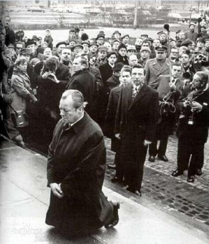 戰(zhàn)后西德為了修復(fù)與波蘭外交,總理勃蘭特首次訪問(wèn)波蘭。外交活動(dòng)之一就是向猶太英雄紀(jì)念碑敬獻(xiàn)花圈,勃蘭特禮畢后無(wú)意間與圍觀的波蘭百姓仇恨的目光對(duì)視,一束束如刀劍般的目光讓勃蘭特情不自禁跪倒在地……這一跪讓所有人都意外驚愕,一位記者反應(yīng)最快按下快門(mén)捕捉到了那個(gè)歷史時(shí)刻,這就是歐洲外交史上的“勃蘭特華沙之跪”。