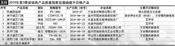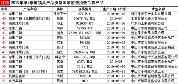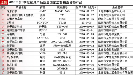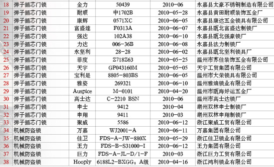 抽查范圍:遼寧、上海、浙江、廣東等4個(gè)省、直轄市80家企業(yè)生產(chǎn)的80種產(chǎn)品,包括:彈子插芯門鎖、球形門鎖、自行車鎖、機(jī)械防盜鎖