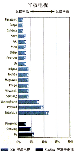 在18種LCD液晶電視品牌中,三菱(Mitsubishi),Polaroid和Westinghouse是其中返修率最高的,而等離子電視則相對較可靠。這是從2007?2010上半年通過消費者購買的198049臺LCD液晶電視和29794臺等離子電視中得出的結(jié)果。這些數(shù)據(jù)顯示在下列情況時,平板電腦會較早的出現(xiàn)故障:曾返修過的68%的電視在前12個月中仍舊會出現(xiàn)返修。此外,遇到電視返修的76%的消費者不用支付費用,其原因可能是大部分的新電視有12個月的質(zhì)保期。