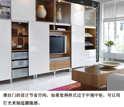 小空間內(nèi),如果沒有過硬的收納功夫,任何多余的擺設(shè)都會顯得擁擠凌亂。電視機、DVD、各種碟片足以把客廳一角搞得一塌糊涂。選擇帶推拉門的電視柜,書、雜志、光盤、電視都能裝進去。電視采用壁掛方式,顯得干凈利落??赐觌娨暎淹评T關(guān)上,時刻保持客廳清爽整潔。推拉門最適合小戶型,節(jié)省空間。在電視柜上面,高度正好和人的視線持平,可以擺放一些裝飾物。