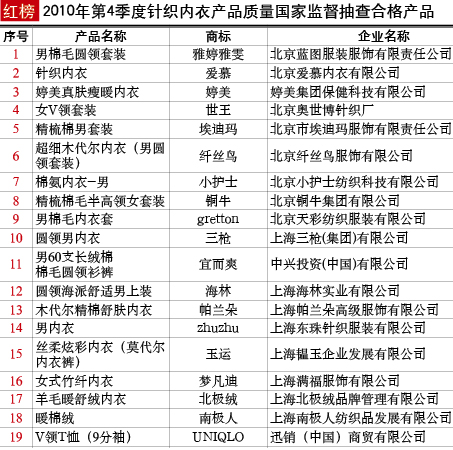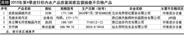 抽查概況:對(duì)針織內(nèi)衣產(chǎn)品的甲醛含量、pH值、可分解芳香胺染料、耐水色牢度、耐堿汗?jié)n色牢度、耐酸汗?jié)n色牢度、耐干摩擦色牢度、耐洗色牢度、纖維成分含量等9個(gè)項(xiàng)目進(jìn)行了檢驗(yàn)。本次抽查,有4種產(chǎn)品不合格