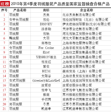 抽查概況:對羽絨服裝產(chǎn)品的面料纖維含量、里料纖維含量、甲醛含量、pH值、耐水色牢度、耐洗色牢度、耐干、濕摩擦色牢度、羽絨含絨量、耗氧量、清潔度、氣味等級、嗜溫性需氧菌數(shù)、糞鏈球菌數(shù)、亞硫酸還原的梭狀芽胞桿菌數(shù)、沙門氏菌、可分解芳香胺染料等17個項目進(jìn)行了檢驗(yàn)。本次抽查,有4種產(chǎn)品不合格