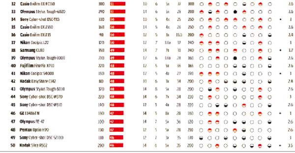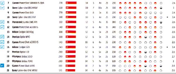 帶有不可伸縮鏡頭的相機(jī),甚至開啟時不會延伸到機(jī)身之外,這類相機(jī)纖薄美觀,但大多數(shù)機(jī)型費用增加了300美元,也未必有最好的畫質(zhì)。例如,9款微型數(shù)碼相機(jī)在正常光線、暗光和閃光燈條件下拍攝效果非常好,但所有機(jī)型都為可伸縮鏡頭。此次測評中包括不可伸縮鏡頭的低端數(shù)碼相機(jī)如下:Casio(卡西歐)Exilim EX-G1; Fujifilm(富士)FinePix AV100, FinePix XP10以及FinePix270; Kodark(柯達(dá))Slice R502; Nikon(尼康) Coolpix S1000pj和Coolpix S70;Olympus (奧利巴斯)Stylus Tough-6020, Stylus Tough-3000和StylusTough-8010; Panasonic(松下)Lumix DMC-FP1和LumixDMC-FP3;Pentax(賓得)Optio W90; 以及Sony(索尼)Cyber-shotDSC-TX7和Cyber-shot DSC-TX5。
