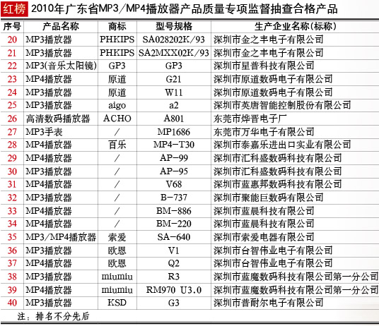 抽查范圍:深圳、東莞、中山、惠州等4個(gè)市56家企業(yè)生產(chǎn)的MP3、MP4播放器產(chǎn)品56批次