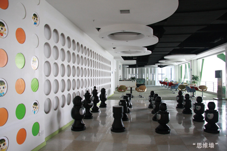 記者看到,一層大堂地面采用了西洋象棋格的設(shè)計(jì)形式,體現(xiàn)了貝因美的博弈和趣味,并與大樓外觀黑白魔方的概念相呼應(yīng)。兩個(gè)玫紅色的沙發(fā)給人以亮麗、活潑的感覺,供來訪者休息等待。