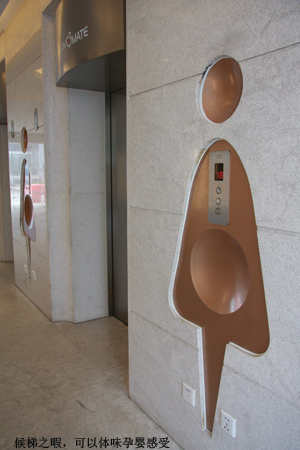 有意思的是,在辦公區(qū)每層的電梯口,墻體上都有一個(gè)人形的浮雕,特別是其身體部分有一個(gè)凹陷的圓形,來訪者可以將肚子貼近凹陷處,形象地感知懷孕媽媽的幸福與不易。