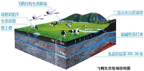 飛鶴牧場(chǎng)毗鄰黑龍江省二克山——老黑山克洛新生代火山活動(dòng)帶,地下出產(chǎn)大量天然蘇打水,牧場(chǎng)中的奶牛全部飲用弱堿性蘇打水。此外,飛鶴牧場(chǎng)緊鄰扎龍濕地自然保護(hù)區(qū),植被豐茂、水資源豐富,為飛鶴牧場(chǎng)制造了一個(gè)清潔的小氣候環(huán)境。