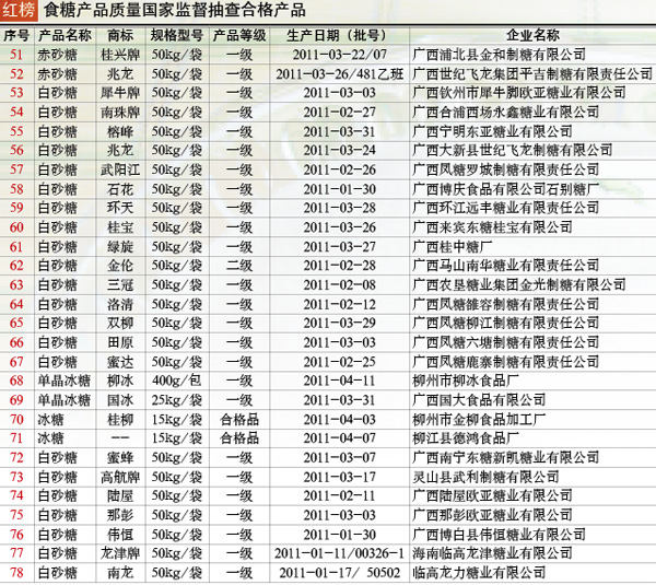 抽查范圍:山西、山東、廣東、廣西、海南、云南、新疆等7個省、自治區(qū)110家企業(yè)生產(chǎn)的110種食糖產(chǎn)品,包括白砂糖、綿白糖、赤砂糖、單晶體冰糖和冰片糖5個品種