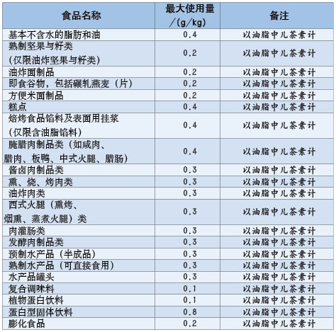 GB2760-2011《食品安全國(guó)家標(biāo)準(zhǔn) 食品添加劑使用標(biāo)準(zhǔn)》規(guī)定,茶多酚可作為抗氧化劑使用,具體使用范圍見(jiàn)下表。