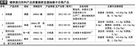 2012年9月,國(guó)家質(zhì)量監(jiān)督檢驗(yàn)檢疫總局公布了2012年第3批產(chǎn)品質(zhì)量國(guó)家監(jiān)督抽查結(jié)果,其中包括植物蛋白飲料產(chǎn)品質(zhì)量國(guó)家監(jiān)督抽查結(jié)果。