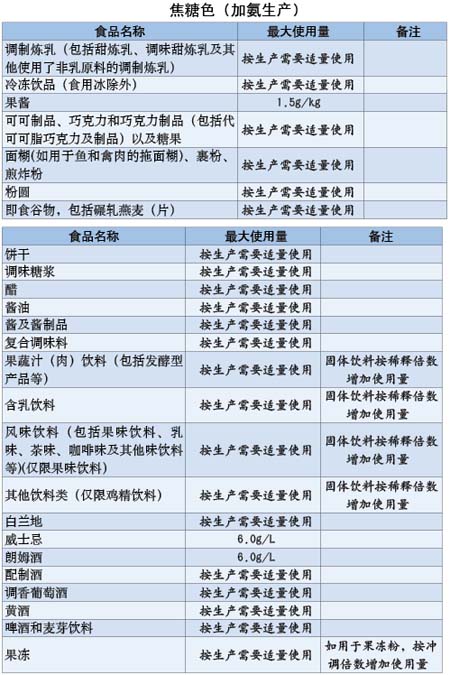GB 2760-2011《食品安全國家標準食品添加劑使用標準》規(guī)定,焦糖色可作為著色劑使用,各種制法的焦糖色具體使用范圍見下表。