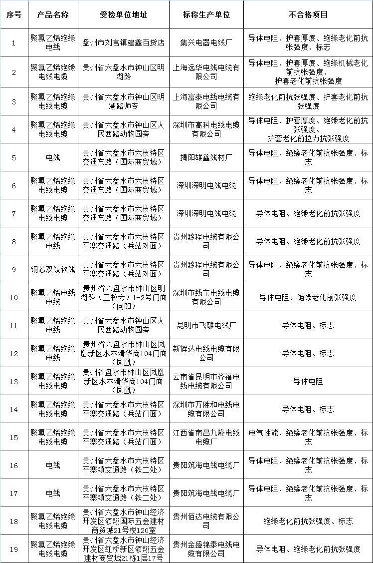 中國質量新聞網訊(張蒙) 近日,六盤水市市場監(jiān)督管理局發(fā)布公告稱,抽查發(fā)現(xiàn)不合格電線電纜產品19批次,涉及16家線纜企業(yè)。