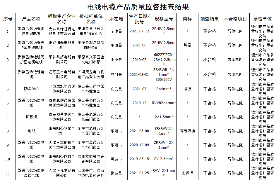 此次被抽檢出不合格產(chǎn)品的企業(yè)涉及:陽谷坤泰電線電纜廠、陽谷共輝電纜有限公司、江蘇三木電纜有限公司、大名正光電纜有限公司、山東陽谷同鑫電纜有限公司等11家線纜企業(yè)。