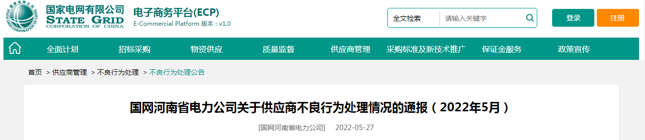 中國質(zhì)量新聞網(wǎng)訊(張蒙) 5月27日,國家電網(wǎng)電子商務平臺發(fā)布通報,對出現(xiàn)重大產(chǎn)品質(zhì)量問題、履約不誠信等問題的供應商進行了處理。