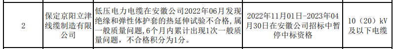 《國網(wǎng)安徽省電力有限公司關(guān)于供應(yīng)商不良行為處理情況的通報(bào)(2022年11月)》顯示,保定京陽立津線纜制造有限公司2022年11月01日-2023年04月30日在安徽公司招標(biāo)中暫停中標(biāo)資格。原因是安徽公司在2022年06月發(fā)現(xiàn)其低壓電力電纜絕緣和彈性體護(hù)套的熱延伸試驗(yàn)不合格,屬一般質(zhì)量問題,6個月內(nèi)累計(jì)出現(xiàn)1次一般質(zhì)量問題,不合格積分為1分。處理范圍包括10(20)kV及以下電纜。