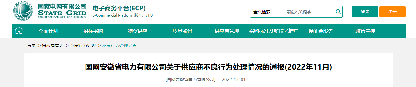 中國質(zhì)量新聞網(wǎng)訊(張蒙) 11月1日,國家電網(wǎng)電子商務(wù)平臺發(fā)布《國網(wǎng)安徽省電力有限公司關(guān)于供應(yīng)商不良行為處理情況的通報(bào)(2022年11月)》。
