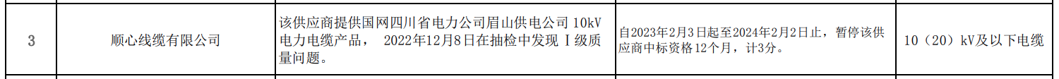 《國(guó)網(wǎng)四川電力有限公司關(guān)于供應(yīng)商不良行為處理情況的通報(bào)(2023年2月)》顯示,2022年12月8日在抽檢中發(fā)現(xiàn),順心線(xiàn)纜有限公司提供給國(guó)網(wǎng)四川省電力公司眉山供電公司10kV電力電纜產(chǎn)品出現(xiàn)Ⅰ級(jí)質(zhì)量問(wèn)題。處理措施為:自2023年2月3日起至2024年2月2日止,暫停該供應(yīng)商10(20)kV及以下電纜產(chǎn)品中標(biāo)資格12個(gè)月。