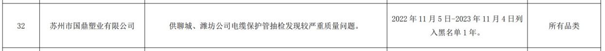 《國網(wǎng)山東省電力公司關于供應商不良行為處理情況的通報》顯示,蘇州市國鼎塑業(yè)有限公司供聊城、濰坊公司的電纜保護管抽檢發(fā)現(xiàn)較嚴重質(zhì)量問題,被國網(wǎng)山東列入黑名單1年。
