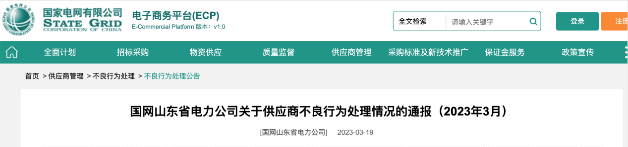 中國質(zhì)量新聞網(wǎng)訊(明曉眢)3月19日,國家電網(wǎng)電子商務(wù)平臺(tái)發(fā)布《國網(wǎng)山東省電力有限公司關(guān)于供應(yīng)商不良行為處理情況的通報(bào)(2023年3月)》。