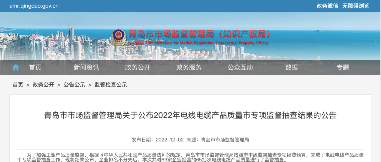 中國質量新聞網訊(明曉眢)日前,青島市市場監(jiān)督管理局發(fā)布《關于公布2022年電線電纜產品質量市專項監(jiān)督抽查結果的公告》。
