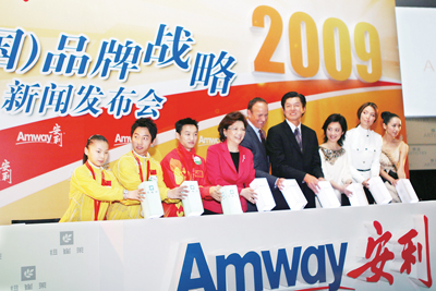 12月6日,直銷龍頭企業(yè)安利在北京正式啟動了“點亮2009”品牌戰(zhàn)略。安利同時推出豪華代言人陣容:中國男女體操隊將代言旗下紐崔萊品牌,許戈輝、侯宏瀾、馬艷麗三位明星則成為雅姿品牌代言人。安利表示將通過一系列強力品牌擴張舉措,帶動2009年業(yè)績再創(chuàng)輝煌。圖為安利公司管理層與眾明星代言人一起,將品牌能量塊拼合,點亮了背景板上碩大的“2009”字樣,表示了公司對中國經濟前景的堅定信心。