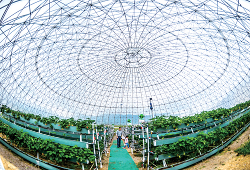圖為4月9日,游客們在“花漾星球太空農(nóng)場”的生態(tài)大棚內(nèi)采摘生態(tài)草莓。