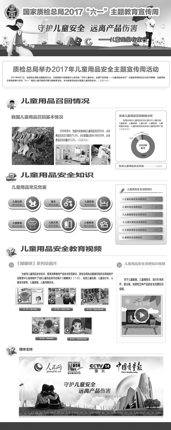 活動期間,質檢總局執(zhí)法督查司組織總局缺陷產品管理中心,聯(lián)合人民網、新華網、中央電視臺和中國質量報等媒體,通過設立???、專欄、專題網站和專題節(jié)目等方式,分4個板塊向消費者宣傳兒童用品安全知識,避免意外傷害,保護兒童健康安全。