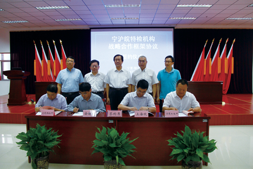 安徽省質(zhì)監(jiān)局副局長高宗宏(第二排左二)出席滬皖寧三省市特檢機(jī)構(gòu)戰(zhàn)略合作協(xié)議簽字儀式