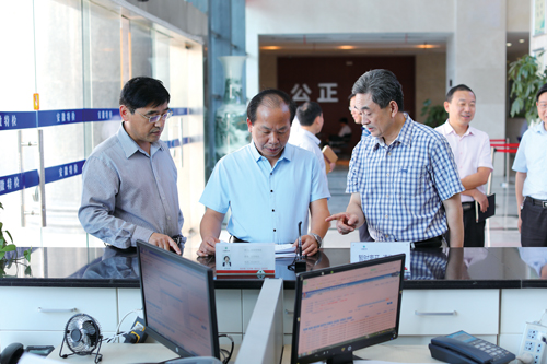 安徽省質(zhì)監(jiān)局副局長丁祖權(quán)(前排中)在省特種設(shè)備檢測院辦事大廳調(diào)研
