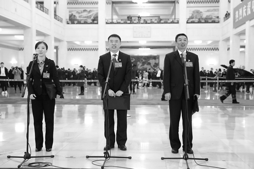 10月18日,中國共產(chǎn)黨第十九次全國代表大會在北京人民大會堂開幕。這是大會開幕式前,薛瑩、李萬君、許啟金代表(自左至右)接受采訪。 新華社記者 陳建力 攝