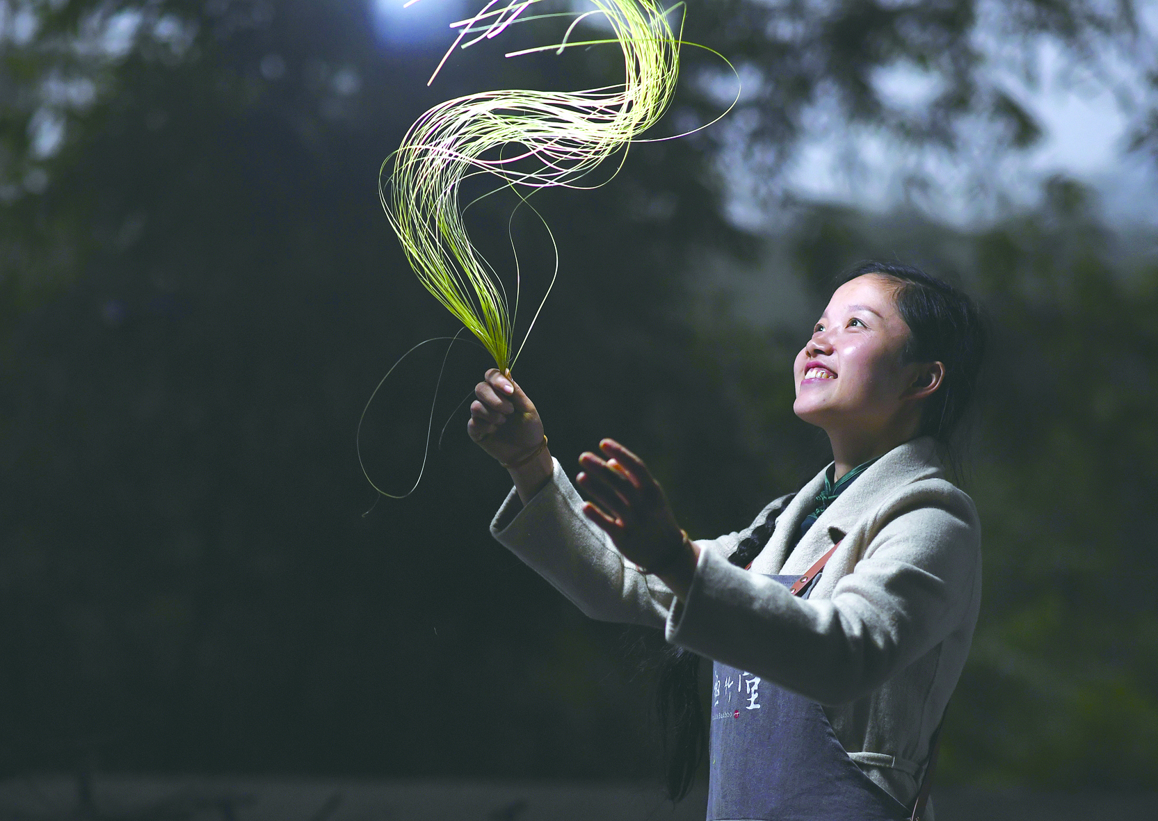 “90后”苗族姑娘楊昌芹是貴州省級非物質(zhì)文化遺產(chǎn)“赤水竹編”傳承人。2007年,她從家鄉(xiāng)來到貴州赤水市學(xué)習(xí)竹編,從此扎根竹鄉(xiāng)赤水,傳承竹編非遺技藝。楊昌芹說,經(jīng)過殺青、破篾、染色、拉絲、編織等20多道工序后制成的竹編工藝品,價值可達(dá)幾百甚至幾千元。圖為楊昌芹在非遺赤水竹編培訓(xùn)基地展示新制作的竹絲。