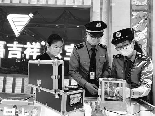 圖為該局執(zhí)法人員在用計(jì)量砝碼對(duì)相關(guān)計(jì)量器具進(jìn)行校對(duì)。