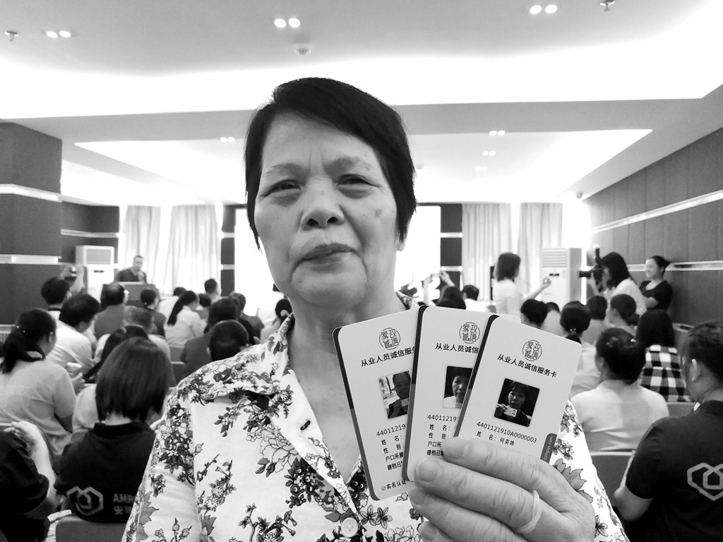 2019年10月11日,廣州市家庭服務(wù)行業(yè)協(xié)會(huì)發(fā)出第一批“家政服務(wù)員誠(chéng)信服務(wù)卡”,今后雇主用手機(jī)掃一掃卡上的二維碼,即可查詢(xún)家政從業(yè)人員的誠(chéng)信服務(wù)記錄。圖為廣州一家家政企業(yè)代表展示領(lǐng)到的“家政服務(wù)員誠(chéng)信服務(wù)卡”。 程景偉 攝