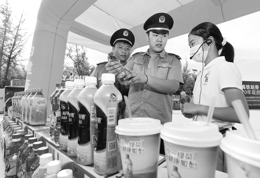 圖為工作人員在南湖公園檢查景區(qū)售貨亭銷售的商品。
