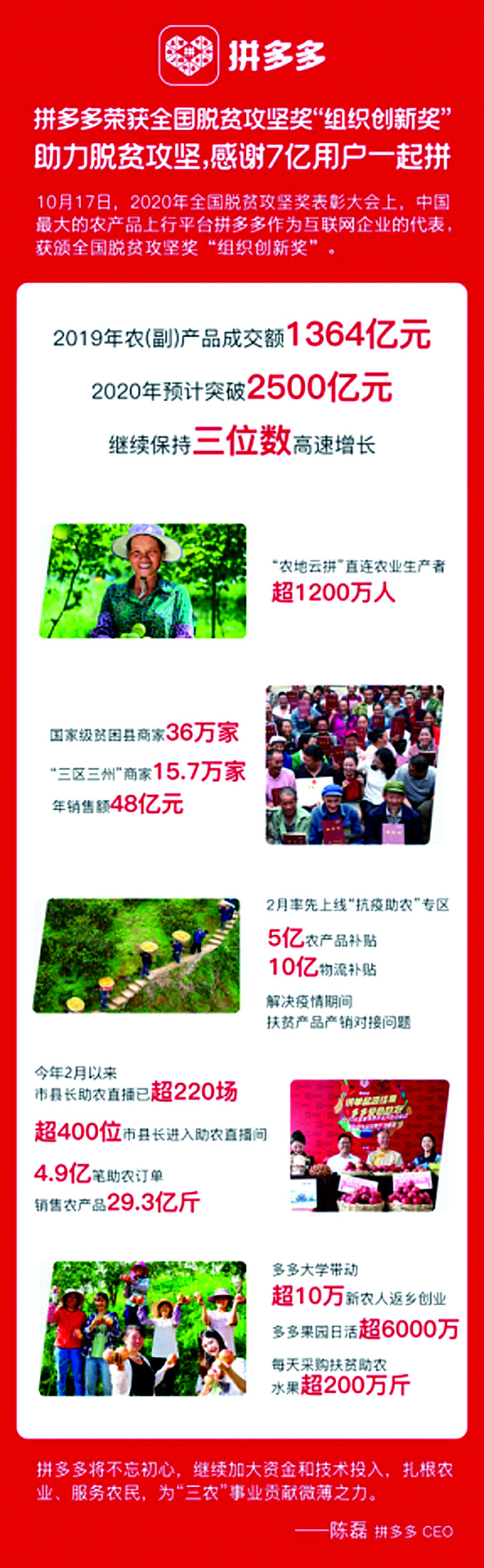 拼多多CEO陳磊在參加表彰大會時表示:“獲頒全國脫貧攻堅‘組織創(chuàng)新獎’,是對所有拼多多人的巨大鼓舞,同時更是沉甸甸的責任。作為依托農產品起家的新電商平臺,拼多多將繼續(xù)恪守扶貧助農的本分,努力為決戰(zhàn)脫貧攻堅、實現鄉(xiāng)村振興作出應有的貢獻?!?/p>