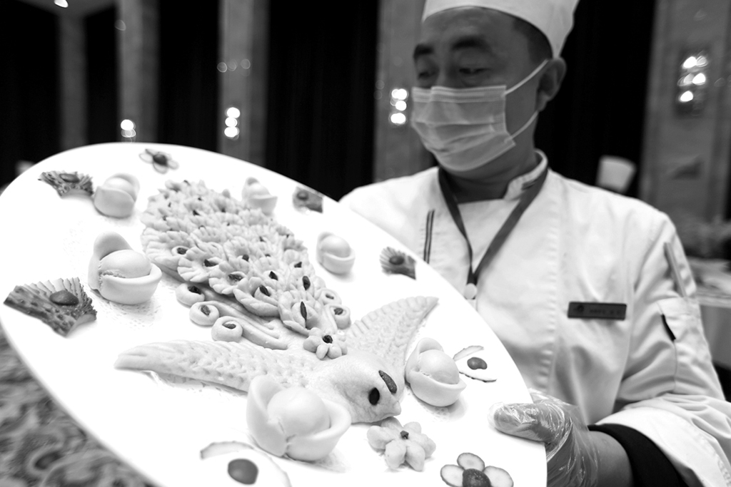 12月12日,山東省沂南縣舉行文化旅游行業(yè)美食大賽,當(dāng)?shù)靥厣r(nóng)家樂和涉旅餐飲企業(yè)的80多名廚師參加了熱菜、涼菜、面點(diǎn)、雕刻等項(xiàng)目的比拼。此次大賽旨在提升當(dāng)?shù)芈糜尾惋嫹?wù)水平,推動(dòng)全域旅游發(fā)展。圖為一位參賽廚師展示其制作的面點(diǎn)。 王彥冰 攝