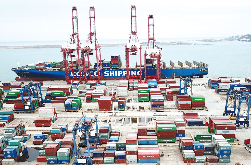 圖為4月13日,船舶在江蘇連云港港集裝箱碼頭裝卸集裝箱。耿玉和 攝