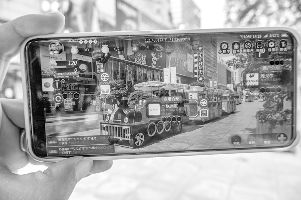 近日,上海上線首個(gè)帶AR功能的商圈導(dǎo)游導(dǎo)覽App——“玩轉(zhuǎn)南步街”。打開攝像頭,對(duì)準(zhǔn)南京路上的街景,商業(yè)設(shè)施清晰可見,旁邊還自帶“字幕”,顯示出商場(chǎng)的名稱以及步行距離。該App引入最新AR游戲引擎,融入時(shí)下流行的“沉浸式劇本”“組團(tuán)對(duì)戰(zhàn)”等游戲形式,把旅游購物、信息獲取、文化推廣以及商業(yè)服務(wù)結(jié)合到場(chǎng)景體驗(yàn)。圖為游客使用“玩轉(zhuǎn)南步街”。 王 岡 攝