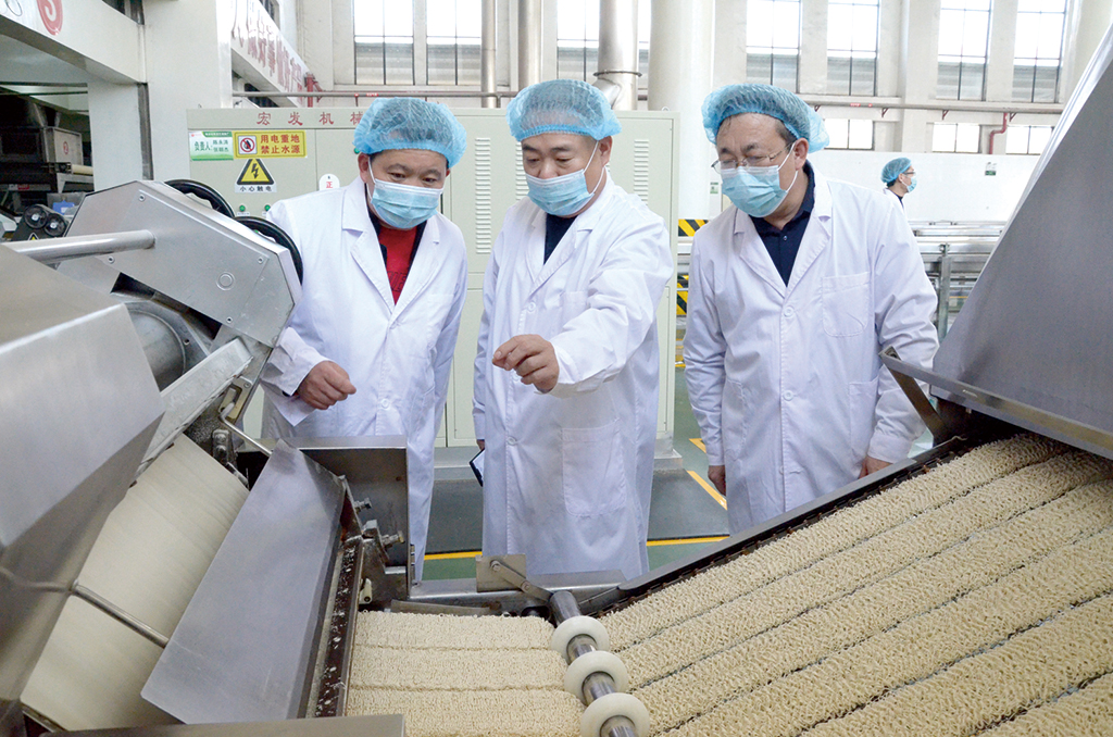 南街村集團(tuán)首席質(zhì)量官王保杰(中)在方便面廠(chǎng)指導(dǎo)生產(chǎn)。