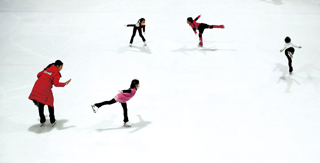 北京浩泰溜冰場(chǎng),教練指導(dǎo)小學(xué)員的動(dòng)作。