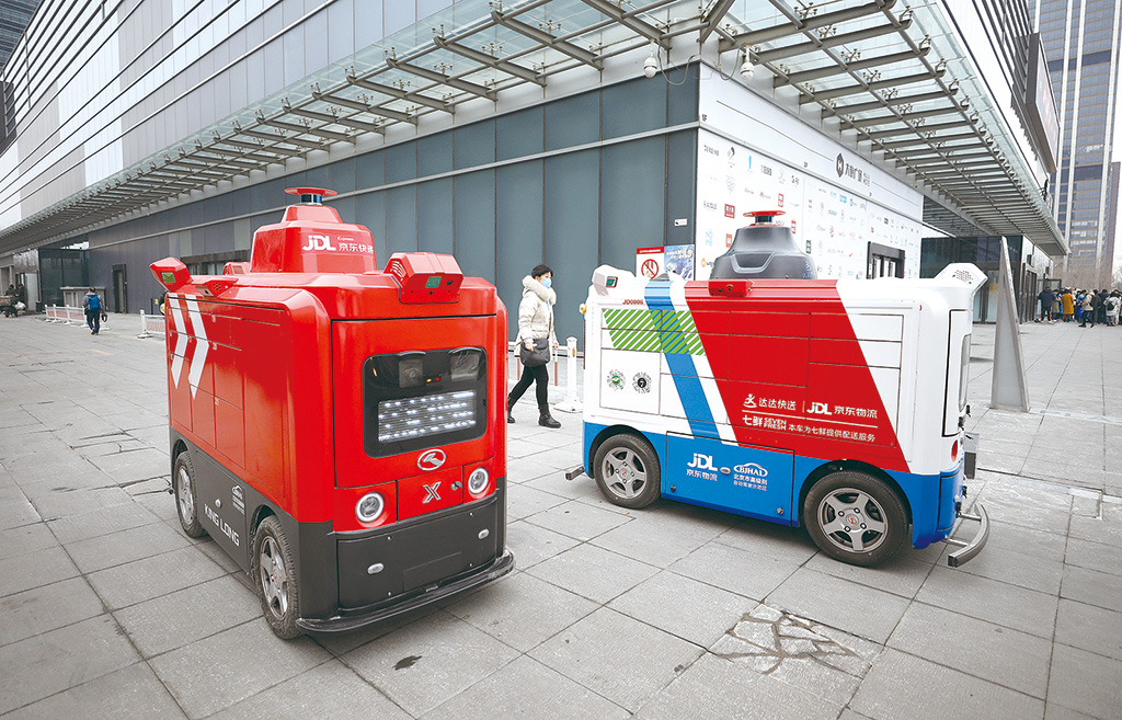 圖為京東七鮮超市的無人配送車正在送貨。