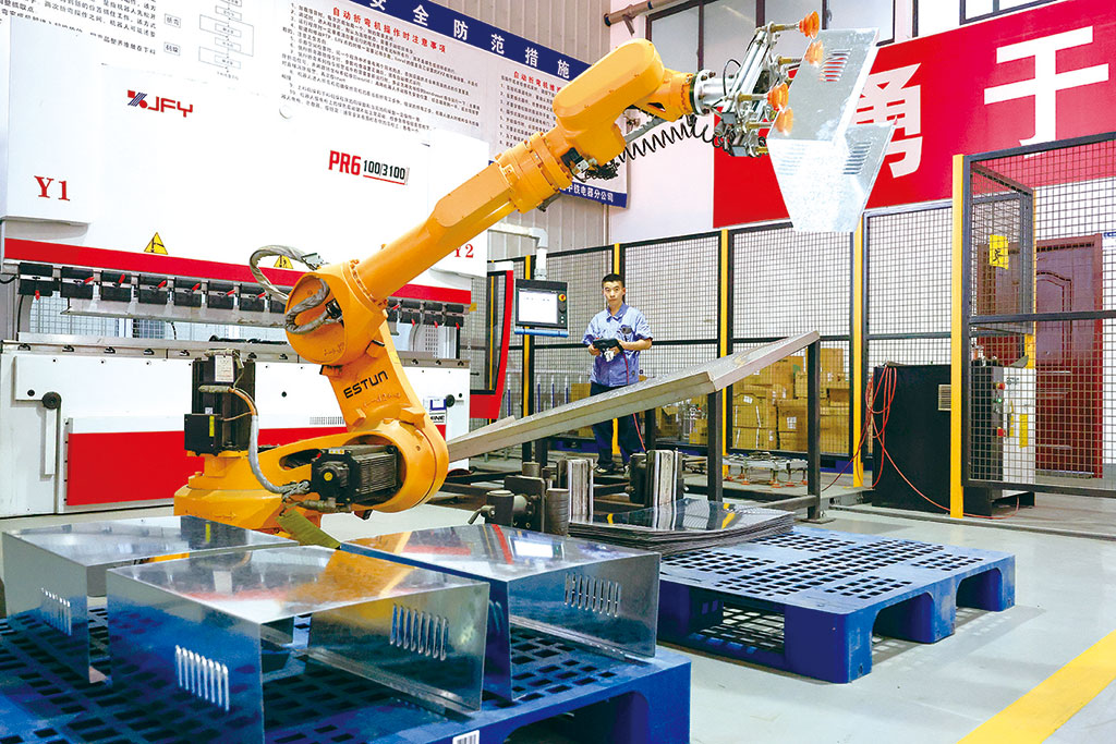 今年以來(lái),安徽省合肥市廬陽(yáng)經(jīng)濟(jì)開(kāi)發(fā)區(qū)積極推動(dòng)傳統(tǒng)制造企業(yè)“設(shè)備換芯、生產(chǎn)換線、機(jī)器換人”進(jìn)程,提高制造業(yè)智能化水平,工業(yè)轉(zhuǎn)型升級(jí)步伐進(jìn)一步加快。在位于開(kāi)發(fā)區(qū)的合肥中鐵電器分公司生產(chǎn)車間,自動(dòng)折彎?rùn)C(jī)器人正在自動(dòng)加工配電箱柜。 趙 明 攝