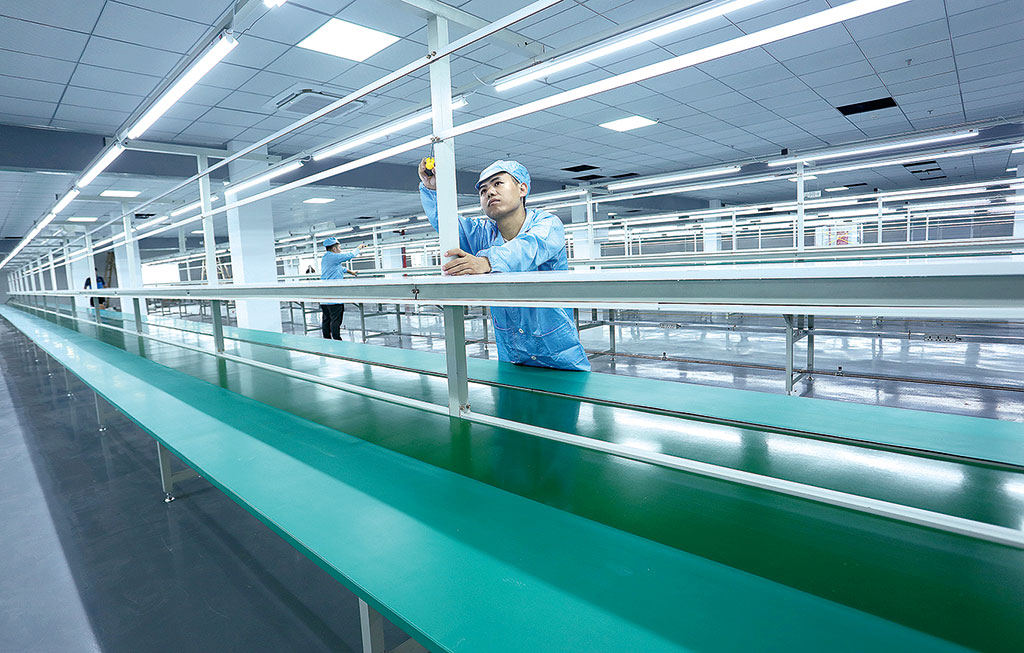 在四川省仁壽經(jīng)濟(jì)開(kāi)發(fā)區(qū)的美加蓉祥電子信息科技產(chǎn)業(yè)園總投資5億元,有標(biāo)準(zhǔn)廠房3萬(wàn)平方米,建設(shè)有智能手機(jī)和平板生產(chǎn)線,7月上旬投產(chǎn)后可實(shí)現(xiàn)年產(chǎn)值15億元,解決就業(yè)500多人。圖為一家電子科技公司的工人正在忙著安裝設(shè)備。 潘建勇 攝